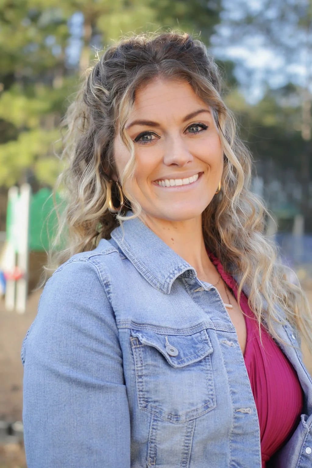 A woman with curly blonde hair, wearing a denim jacket and a magenta top, smiling outdoors with trees and playground equipment in the background.